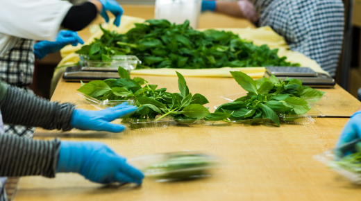 成長したハーブは出荷準備に向けてハウスから巣立ちの時が来ます。摘み取り作業の後に検品・梱包・出荷されます。